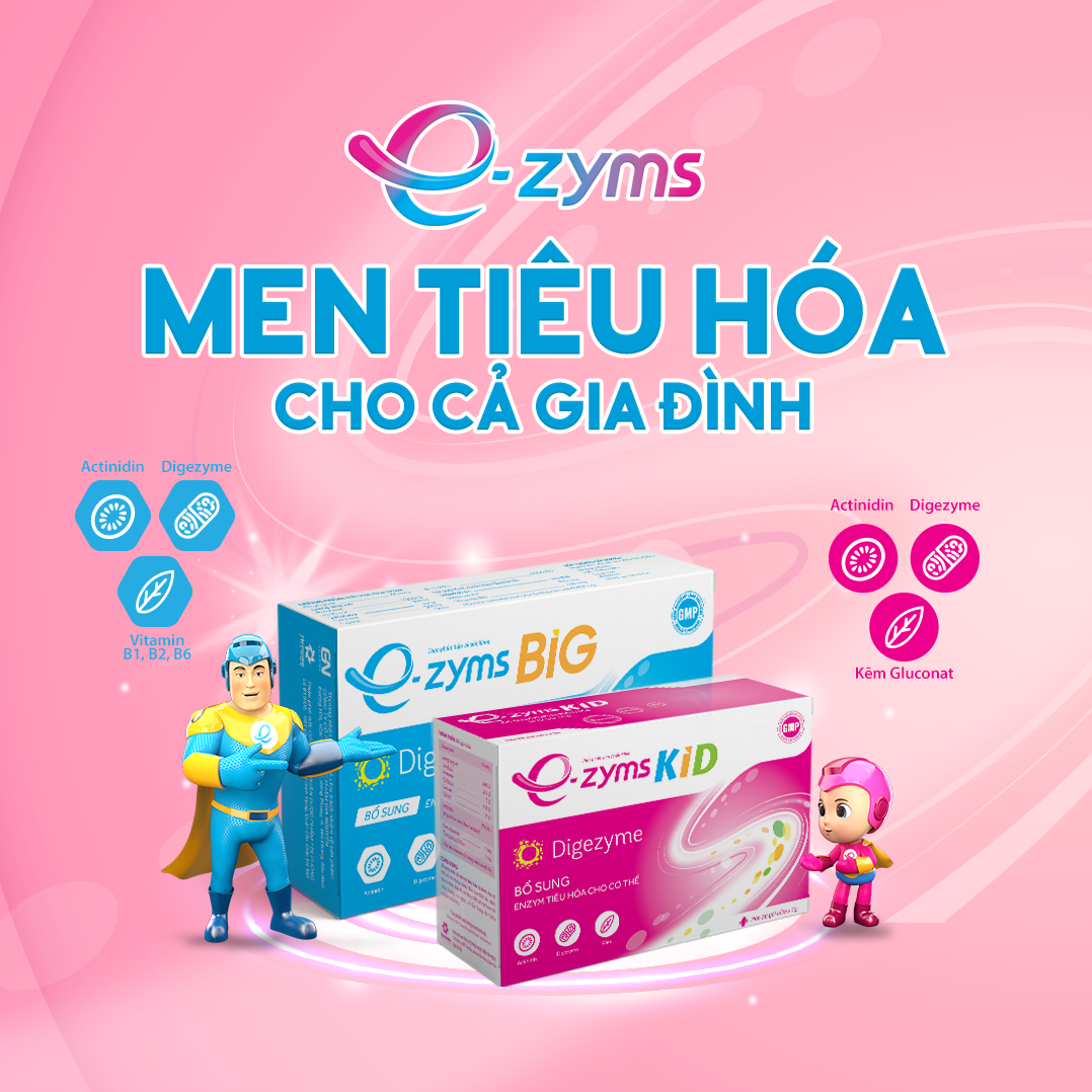 • E-zyms BIG: Men tiêu hóa dành cho người lớn cũng chứa Digezyme, Actinidin nhưng được bổ sung thêm các vitamin B1, B2, B6 giúp hỗ trợ ăn tốt, tiêu hóa khỏe, hạn chế đầy bụng, khó tiêu do thiếu hụt men tiêu hóa gây ra.